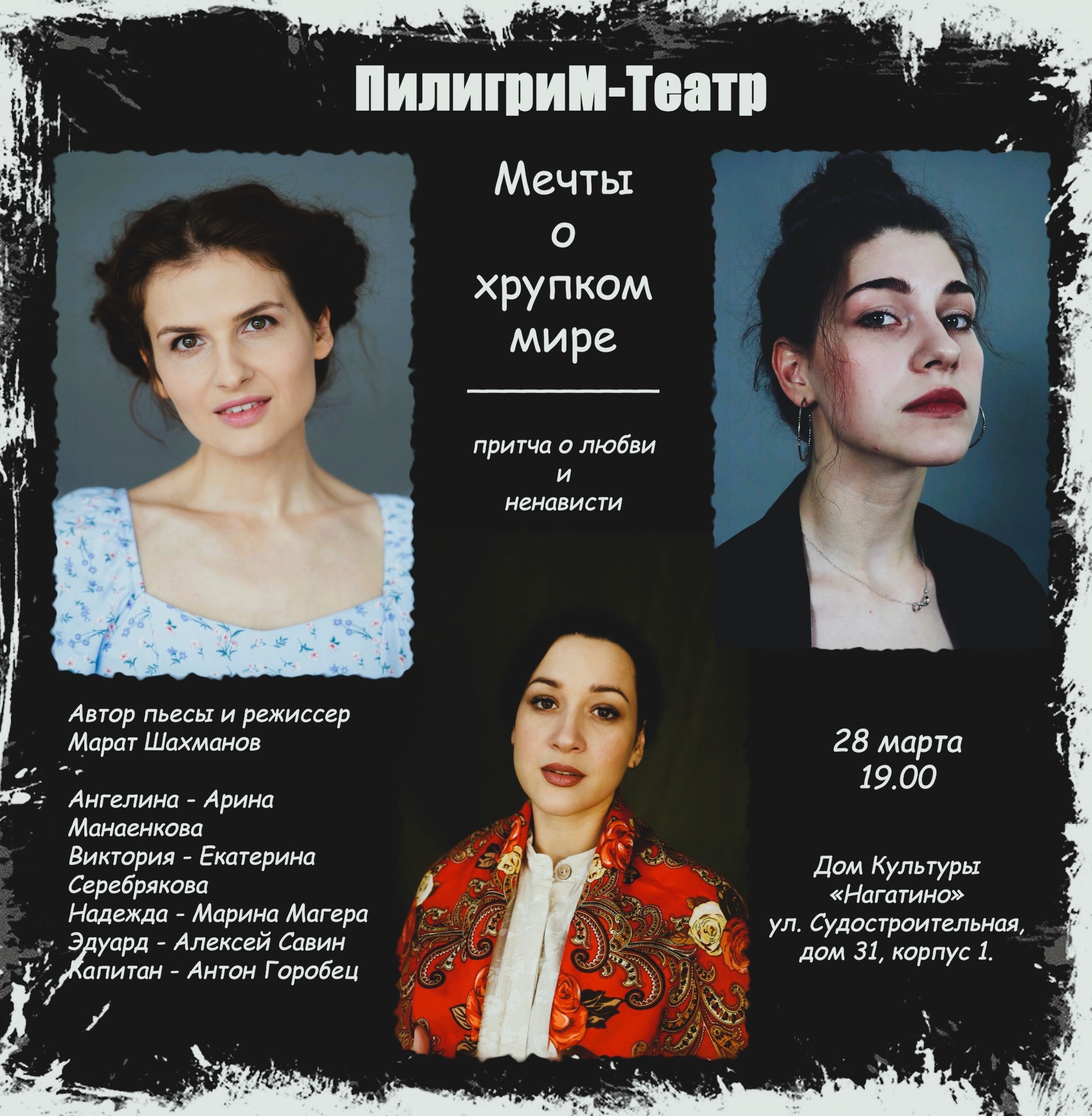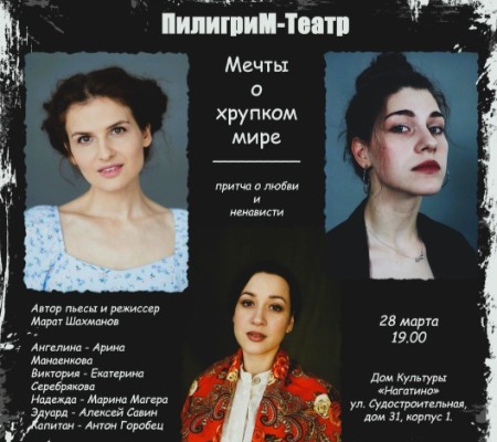 25 января в Москве! ПилигриМ Театр представляет спектакль Спектакль «Мечты о хрупком мире», – Притча о любви и ненависти, войне и мире. Две сестры – Виктория и Ангелина мечтают о любви и счастье, визуализируя их в своем воображении. Одна представляет себя звездой театра, исполняя на сцене желанную роль. Другая видит себя под парусом в объятиях любимого, направляясь с ним к необитаемому острову… В какой-то момент игра становится явью, но не той, о которой им мечталось…